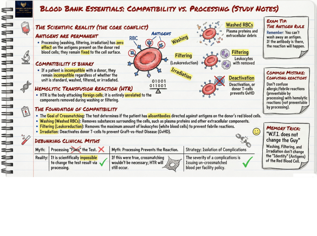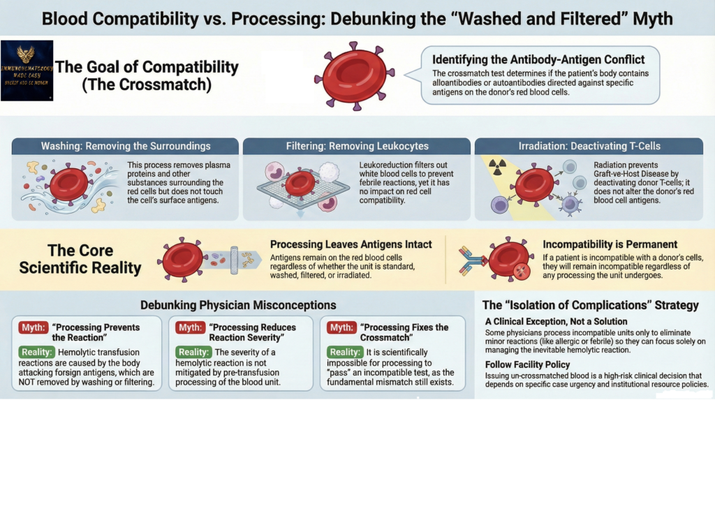 These procedures have no effect on the antigens present on the red blood cells; the antigens remain there regardless. If the patient is compatible with the donor’s cells, they will be compatible whether the unit is standard, washed, filtered, or irradiated. If the patient is incompatible with the donor’s cells, they will remain incompatible regardless of any processing the unit undergoes.